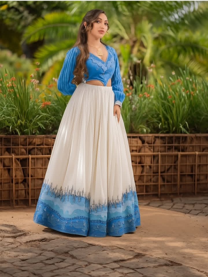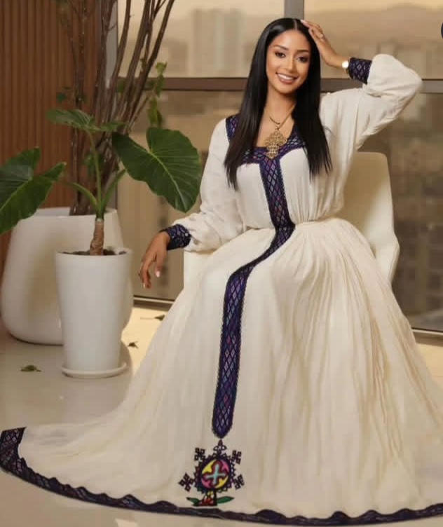 Radiant Ethiopian Dress with Blue Embroidery and Cream Fabric from the Top Diaspora Source